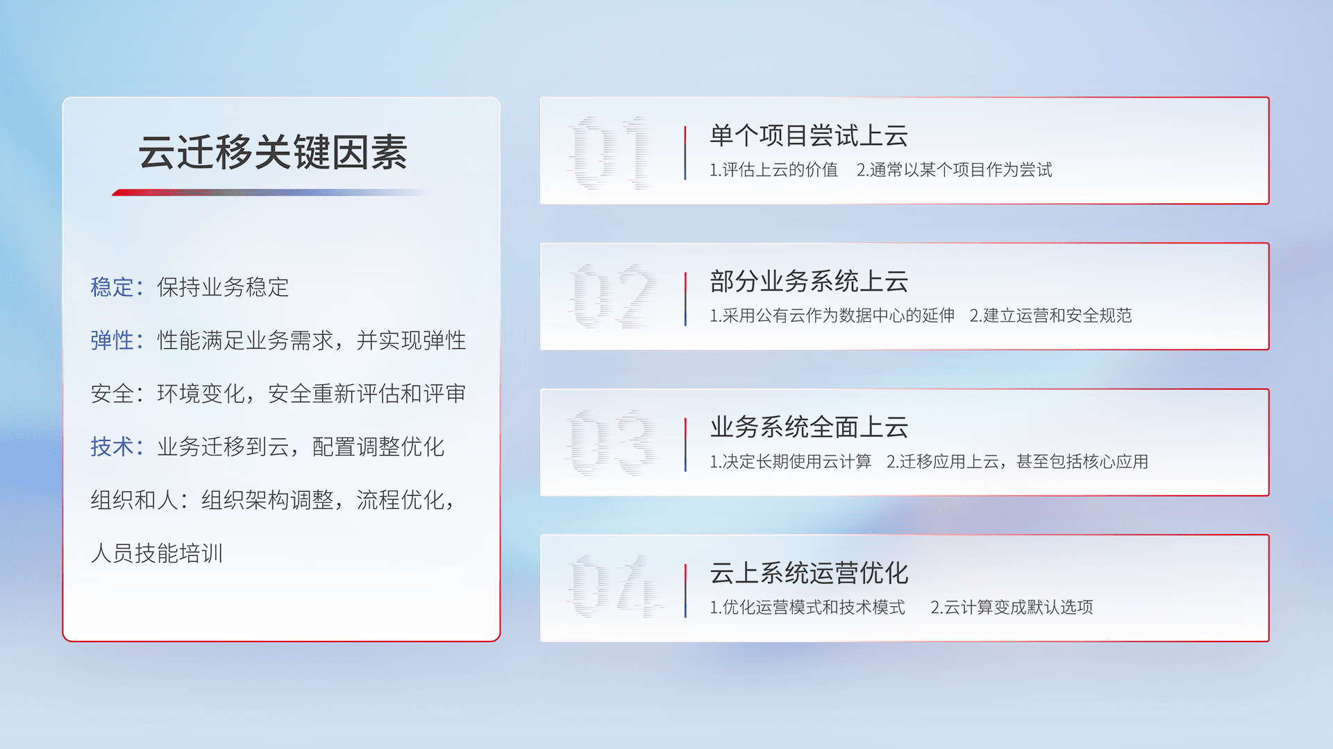 结合实际业务,,,,从规划设计、、、云平台选型、、、云原生改造、、数据迁移、、集成交付,,迁移全过程为客户识别最佳上云路径,,,,做好风险识别管理,,,,设计网络架构、、身份权限、、安全审计合规、、操作审计、、、、日志审计、、、监控告警策略、、多站点容灾设计等,,,,对云上基础设施进行整体规划,,提升IT治理水平,,,,以满足弹性、、、高可用、、、、高性能的需求。。。。